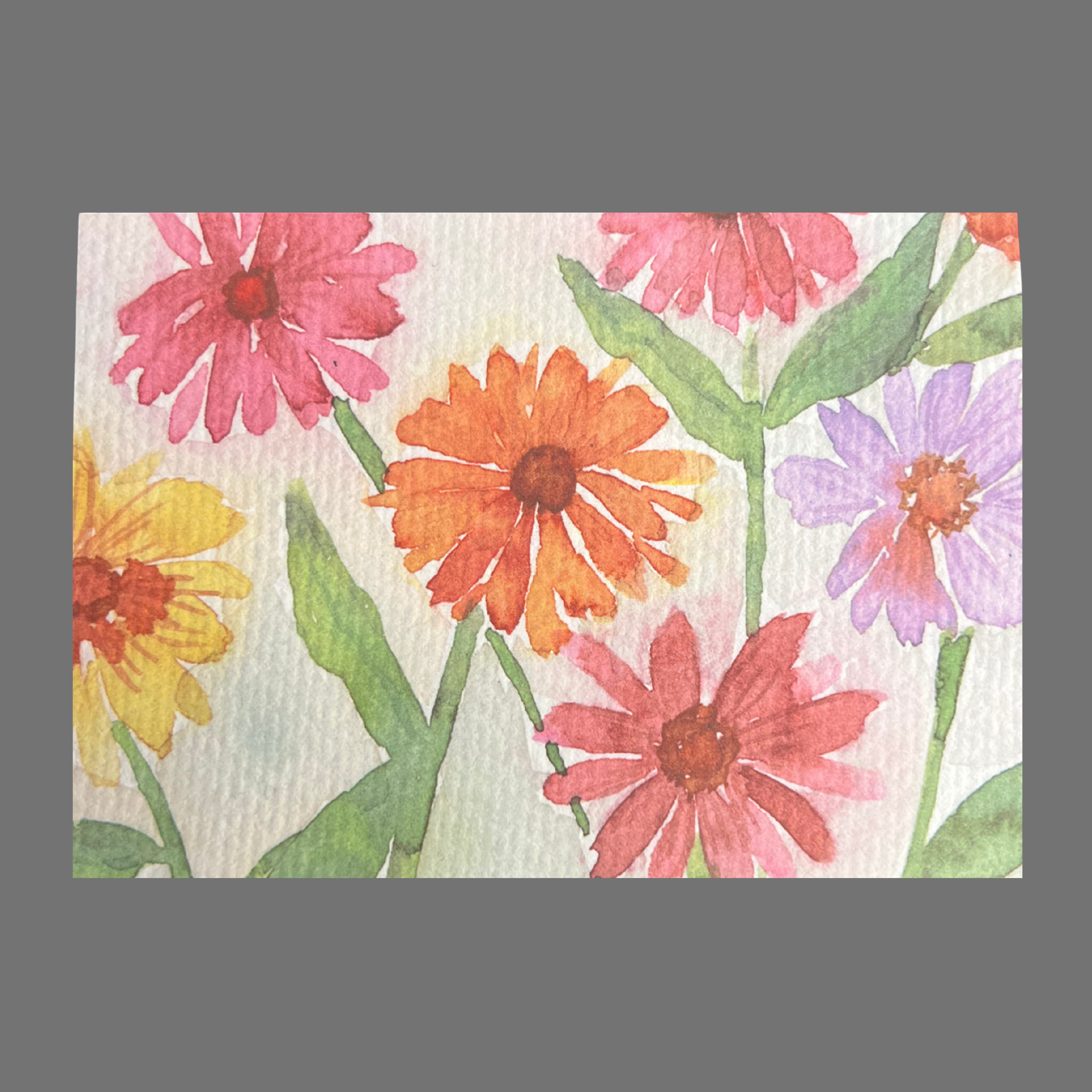 Brighten someone's day with this cheerful flower card bursting with color. These joyful flowers showcase blooms in shades of pink, orange, yellow, and purple among fresh green foliage. The loose, expressive brushstrokes create an energetic and uplifting design that radiates happiness and warmth. This blank card is perfect for celebrations, thank you notes, get well wishes, or simply spreading joy to friends and family.